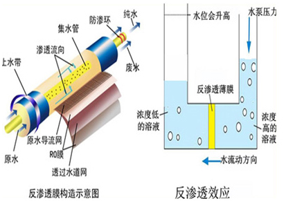 反渗透是一种借助于选择透过(半透过)性膜的工力能以压力为推动力的膜分离技术,当系统中所加的压力大于进水溶液渗透压时,水分子不断地透过膜,经过产水流道流入中心管,然后在一端流出水中的杂质,如离子、有机物、细菌、病毒等,被截留在膜的进水侧,然后在浓水出水端流出,从而达到分离净化目的。